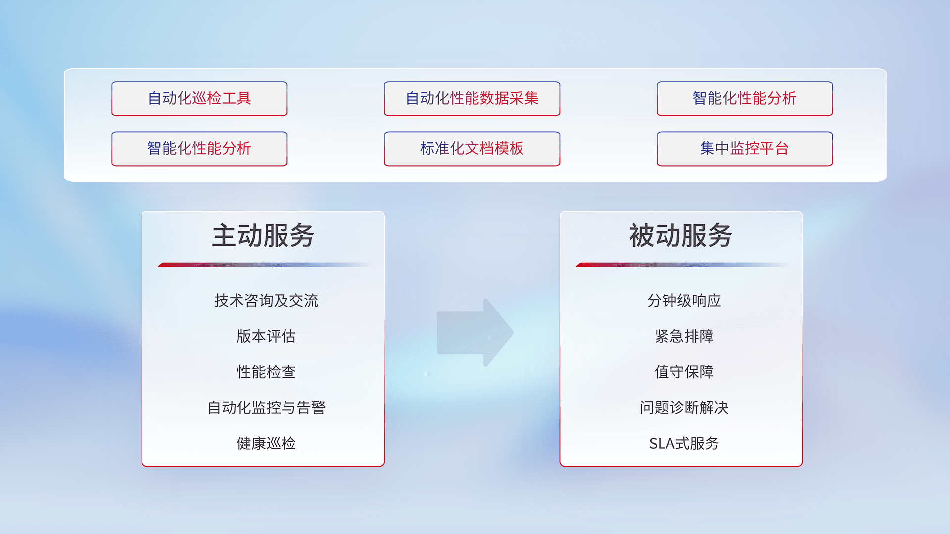 智能化工具和标准化文档,,保障服务质量,,提供主动服务(包含技术咨询、、、、版本评估、、、性能检查、、自动化监控与告警、、健康巡检)和被动服务包含(分钟级响应、、、、紧急排障、、、、值守保障、、、、问题诊断解决、、、、SLA服务)。。。